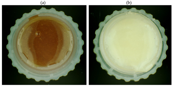 Photo of conventional buckwheat honey (a) and ecological forest honey (b).