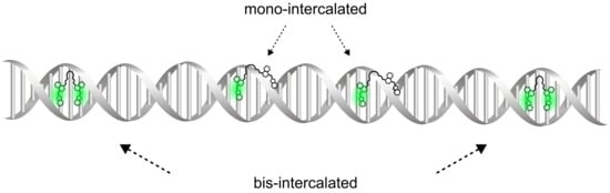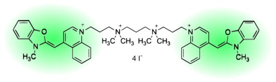 - Larsson, A.; Carlsson, C.; Jonsson, M.; Albinsson, B. Characterization of the Binding of the Fluorescent Dyes YO and YOYO to DNA by Polarized Light Spectroscopy. J. Am. Chem. Soc. 1994, 116, 8459–8465. [Google Scholar] [CrossRef]