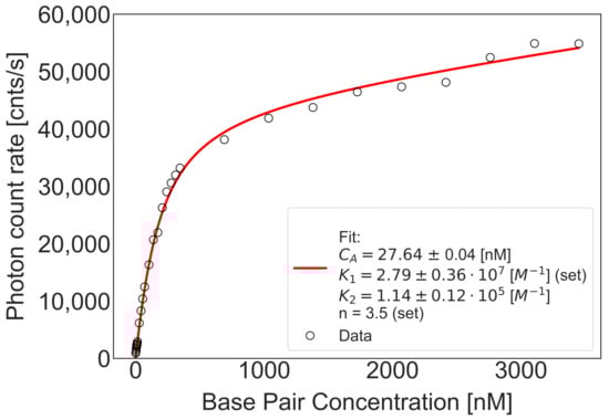 Equilibrium constant determination of YOYO-1–DNA (69 bp) complex formation. Black circles represent data points (countrate acquired for various DNA concentrations added to 20 nM YOYO-1 in titration experiment), red line correspond to fit of Equation (7). Fitting includes interactions for both intercalation models. is a fitted value of dye initial concentration, and are equilibrium constants for mono-intercalation and bis-intercalation, respectively, n is a size of a binding site (see Supplementary Materials, section Size of the binding site).