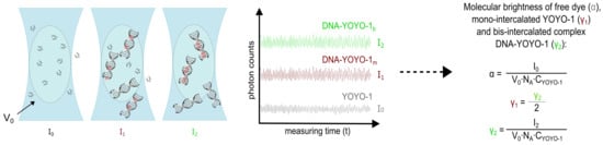 Scheme of the method of molecular brightness determination. In the confocal volume () we collect photons in time (t) by the detector. Knowing the intensity of free and bound dye (, and ) we determine MB for free dye ( = 28 counts per molecule per second, cpm), mono-intercalated YOYO-1 ( = 8400 cpm) and bis-intercalated complex ( = 16,800 cpm), respectively.