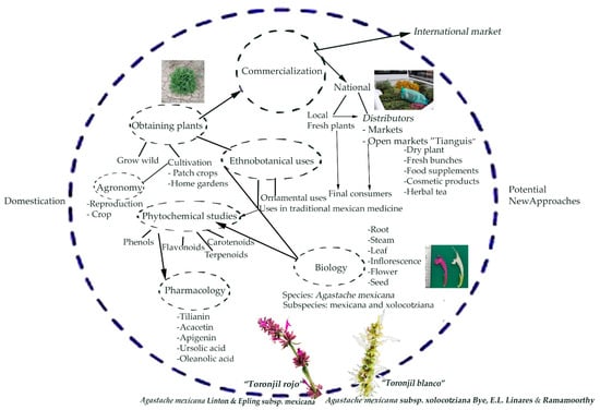 - Carrillo-Galván, G.; Bye, R.; Eguiarte, L.E.; Cristians, S.; Pérez-López, P.; Vergara-Silva, F.; Luna-Cavazos, M. Domestication of aromatic medicinal plants in Mexico: Agastache (Lamiaceae)- A n ethnobotanical, morpho-physiological, and phytochemical analysis. J. Ethnobiol. Ethnomed. 2020, 16, 1–16. [Google Scholar] [CrossRef]