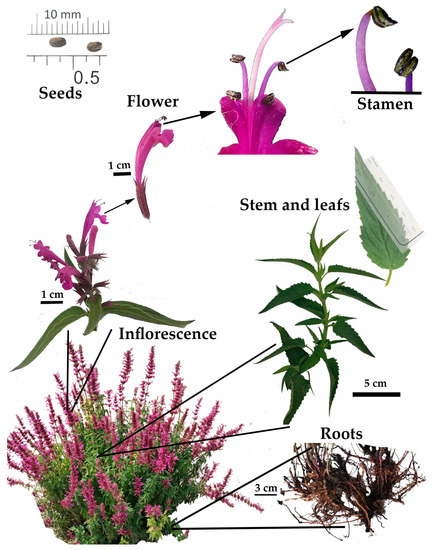 Various plants from the Agastache genus are used for bee forage and honey production [13,14]. Toronjil is a honey plant; its flowers produce nectar for bee collection [15].
