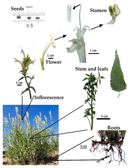 The stem of A. mexicana ssp. mexicana is erect, branched, and four-angled. The basal and middle part of the stem is purple. The form of the leaves is ovate-lanceolate, measuring 4.4 to 6.3 cm long and 2.1 to 2.5 cm wide [2]. The petiole is 1 cm long [2], and the corolla is purplish red to red [2,5]. The seeds measure approximately 4 to 5 mm (Figure 3).