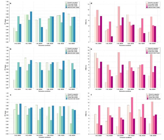 Results from Figure 2 showed that R2 values were high (most were greater than 0.925), excepted the first-order model at 1:40 ratio, 600 W (chlorophyll a and b), 1:80 ratio, 600 W (chlorophyll b). For RMS, only the second-order model had an RMS of less than 10% for all extraction conditions, and the remaining models obtained some conditions with RMS greater than 10%. Specifically, the power-law model had an RMS of 11.7% for antioxidant activity extraction at 1:80; 300 W, the Elovich’s equation had RMS 10.2% and 12.1% for MAE of chlorophyll a (at 1:80; 300 W) and b (at 1:40; 300 W), respectively, and the first-order model had an RMS of more than 10% for both chlorophyll and antioxidant at 1:40 ratio (300 W and 600 W). The second-order model had R2 values higher than 0.948 for all extraction conditions. Therefore, in this case, the second-order model showed the best power of prediction. Many previous studies have confirmed that the second-order model had the best model in extraction processes such as convectional extraction [33,34,35,36], ultrasound-assisted extraction [37,38], high voltage electrical discharge extraction [39], and microwave-assisted extraction [40]. Therefore, in this study, the second-order model was used to characterize the behavior of chlorophyll and antioxidant activity extraction from P. fruticosa leaves via MAE.