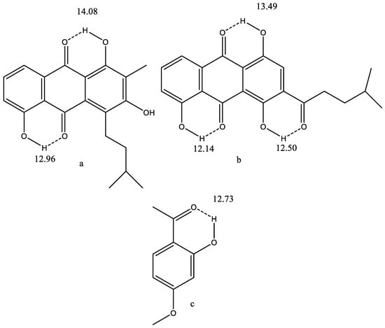 (a,b) Antitumor anthraquinones isolated from sea anemones. From Ref. []. (c) Paeonol from Ref. []. The numbers are OH chemical shifts.