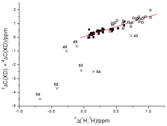 Figure 5 shows that the sum of two- and four-bond deuterium isotope effects on 13C chemical shifts vs. primary tritium isotope effects can be correlated for “static” hydrogen bonded systems, whereas the tautomeric cases marked with crosses fall off that correlation line. The primary isotope effects could also have been primary deuterium isotope effects.