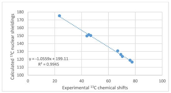 Plot of calculated 13C nuclear shieldings vs. experimental chemical shifts of anhydrogossypol (see Figure 10). 13C NMR data from Ref. [].