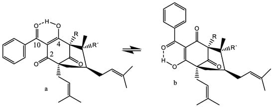 Tautomerism between the (a,b) forms. Structures of R,R′ = H, garciniaphenone and R = prenyl, R′ = H, 7-epi-clusianone.