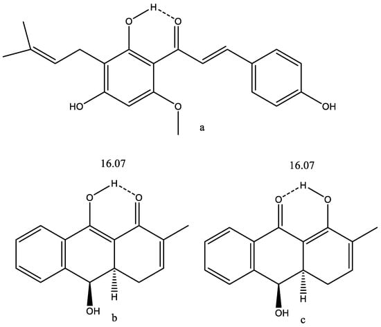A drug has to be able to pass the gut membrane. This ability is normally judged by log P defined as log ([solute].oct/[solute].water), oct being octanol and the solute assumed to be un-ionized. A positive value means it is more lipophilic and membrane-like. Calculational approaches have also been presented []. For compounds with polar substituents, intramolecular hydrogen bonds may be of importance, as the latter changes the polarity of the molecule and alters its possibility to pass membranes. An important factor is the strength of hydrogen bonds, as this determines the ability to maintain the hydrogen bond in hydrogen bonding solvents. The strength can be estimated using XH chemical shifts, X = O, S, N. The larger the chemical shift, the stronger the hydrogen bond (see Figure 1). Another possibility is the deuterium isotope effects on 13C and 15N chemical shifts []. The two parameters, XH chemical shifts and deuterium isotope effects on 13C chemical shifts, are related. The use of isotope effects has the advantage that isotope effects are obtained as a difference (see Section 3) and, in this way, substituent effects and solvent effects are eliminated []. Examples of intramolecular hydrogen bonding are seen in Figure 1a–c.