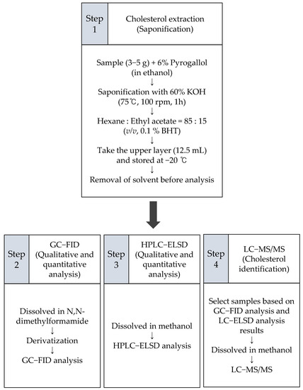Building on the work carried out in the studies mentioned above [17,18,19,20,21,22], this work aims to use three analytical methods to determine the levels of cholesterol in non-animal organisms, particularly, algae and perilla seed oil (categorized as a vegetable oil). To our knowledge, this is the first study to quantify cholesterol content in perilla seed oil. Red algae (Pyropia tenera), brown algae (Saccharina japonica and Undaria pinnatifida), and perilla seed oil (i.e., crude oil extracted from Perilla frutescens) were selected for this study because they are common ingredients in East Asian cuisine (particularly in Korea and Japan). Gas chromatography with flame ionization detection (GC-FID), high-performance liquid chromatography with evaporative light-scattering detection (HPLC-ELSD), and liquid chromatography-tandem mass spectrometry (LC-MS/MS) were employed according to the experimental scheme below (Figure 1). Based on the previous results [17,18,19,20,21,22], little content was expected if cholesterol exists in algae and perilla seed oil, meaning that the possible presence of its isomer lathosterol could mislead the results depending on the characteristics of the analytical methods. The results from these three analytical methods are presented below, and cholesterol content is reported for samples in which its presence was confirmed.