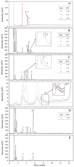 Gas chromatograph-flame ionization detector (GC-FID) chromatogram of a mixed standard (cholesterol, lathosterol, and α-tocopherol) and samples. (A), mixed standard; (B), Pyropia tenera; (C), perilla seed oil; (C *), cholesterol peak of four perilla seed oil samples; (D), Saccharina japonica; (E), Undaria pinnatifida. Peak identification: 1, 5-α-cholestane (IS); 2, α-tocopherol; 3, cholesterol; 4, lathosterol; 5, β-sitosterol a-b, unknown peak; c, unknown peak (RRT: 1.35) around lathosterol and cholesterol. Relative retention time (RRT): value obtained by dividing the compound retention time by the internal standard retention time.