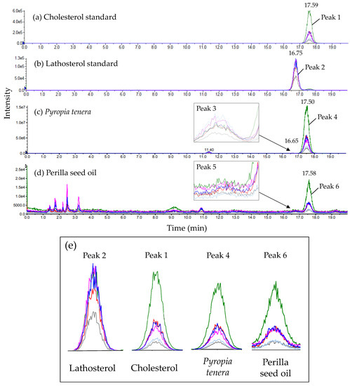 Multiple reaction monitoring (MRM) spectra of cholesterol standard (a), lathosterol standard (b), Pyropia tenera (c), perilla seed oil (d). Enlarged MRM spectrum of each peak 1, 2, 4, and 6 (e).