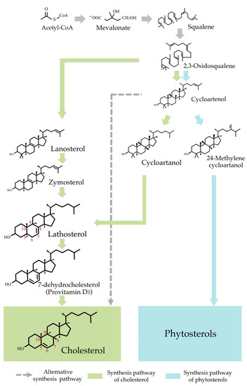 Generally, in animals, 2,3-oxidosqualene is converted to lanosterol through lanosterol synthase, and cholesterol is finally formed via several metabolic compounds [8]. The biosynthetic pathway of cholesterol in plants and algae (Figure 5) is suggested in previous studies [21,39,40]. Yoshida et al. [39] reported that one of the marine algae, Aurantiochytrium, would synthesize cholesterol through lanosterol synthase. On the other hand, a cholesterol synthase pathway through cycloartenol synthase was also suggested. Sonawane et al. [21] reported that 2,3-oxidosqualene is converted to cycloartenol, a cholesterol precursor produced by cycloartenol synthase, in plants (tomato and potato). After the conversion of cycloartenol to cycloartanol, lathosterol, a biosynthetic precursor of cholesterol, is sequentially produced. It can therefore be assumed that since the presence of cholesterol was confirmed in both P. tenera and perilla seed oil by LC-MS/MS, lathosterol may exist (Figure 5). Moreover, an alternative synthesis pathway of cholesterol has been recently proposed in the red algal model [40].