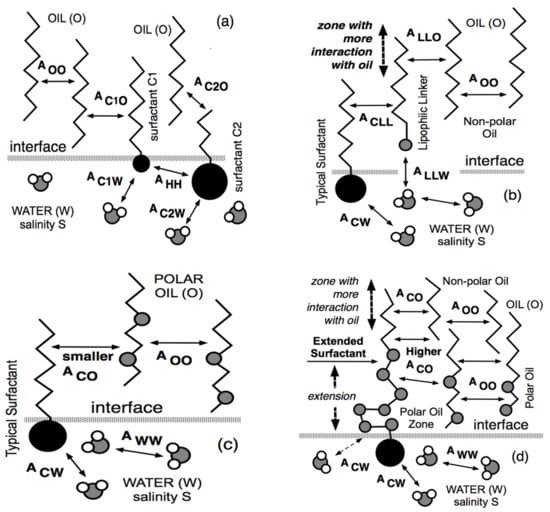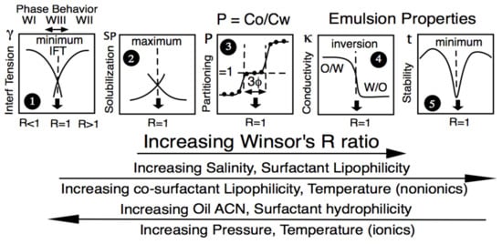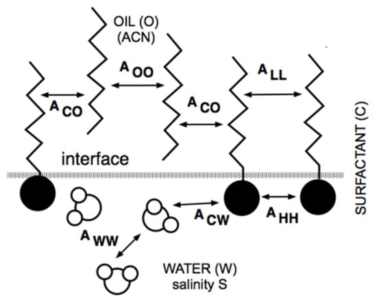 At the same time, but in a completely different research area, Winsor [50] proposed a complex model based on the ratio R of interactions between the surfactant adsorbed at the interface and the neighboring oil and water molecules on both sides of it, indicated explicitly as ACO and ACW in Figure 1.