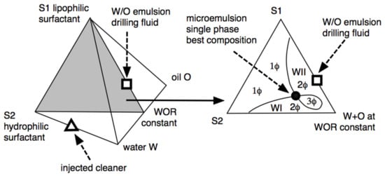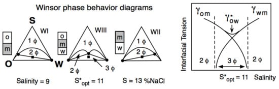 The very specific property shown in Figure 2, i.e., the coincidence of a three-phase behavior and a minimum interfacial tension, was rediscovered in 1975 by industrial and academic researchers dedicated to developing an enhanced oil recovery technique (called EOR) by injecting a surfactant solution in a petroleum reservoir. The formulation corresponding to the middle of the three-phase behavior zone was called “optimum”, i.e., optimum salinity S* in Figure 2. This happens because it produces the very low interfacial tension minimum between brine and petroleum, eliminating the capillary blocking occurring in a porous reservoir after the conventional water flooding secondary recovery [65].