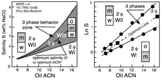 In his research in the late 1940s, Winsor proposed a basic method to study a surfactant–oil–water (SOW) system by determining its phase behavior versus a continuous variation (called a scan) of a variable susceptible to alter at least one of the interactions [51]. In simple systems, these variables typically were the oil nature (e.g., the n-alkane carbon number ACN), the water NaCl salinity (S), the surfactant and co-surfactant type (head or tail nature), the temperature, and eventually the pressure [56,57,58], which is an essential variable in a petroleum reservoir.