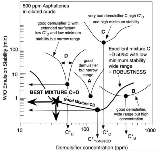 - Rondón, M.; Pereira, J.C.; Bouriat, P.; Graciaa, A.; Lachaise, J.; Salager, J.-L. Breaking of water-in-crude-oil emulsions. 2. Influence of asphaltene concentration and diluent nature on demulsifier action. Energy Fuels 2008, 22, 702–707. [Google Scholar] [CrossRef]