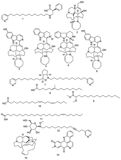 The petroleum ether fraction was first chromatographed on a silica-gel column, and was then subjected to a sephadex LH-20 column and final purification on semi-preparative HPLC, yielding compounds 1–14. These 14 compounds, as shown in Figure 1, were identified based on their HR-ESIMS and by comparison with the literature, as nakinadine B (1), ircinol A (2), 6-hydroxymanzamine A (3), 3,4-dihydromanzamine A, J N-oxide (4), manzamine D (5), 3,4-dihydro-6-hydroxymanzamine A (6), pyrinodemin D (7), 7-methyl-6-hexadecenoic acid (8), methyl 2-methoxyhexadecanoate (9), 11,15-icosadienoicacid (10), 20-hepacosenoic acid (11), amphimedoside C (12), keramaphidin B (13), and amphimedine (14) [16].