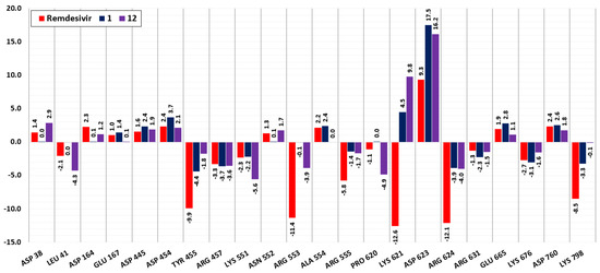 Compound 12 also interacts with Asn37, Lys51, and Cys622 with negative total energies and with Asp452 with positive energy. The following amino acid residues interact exclusively with remdesivir: Lys7, Lys438, Lys545, Lys783, Arg836 interact with negative total energies, and Asp161, Glu436, Ala448, Asp761, Glu811, Asp833, Asp845 interact with positive total energies that weaken the binding of the compound. As can be seen from Figure 5, among the three compounds, remdesivir has significantly stronger interactions with the common interacting amino acid residues. However, the cumulative effect of the interactions of compounds 1 and 12 with other (uncommon) residues results in these compounds having similar total binding energy values to remdesivir.