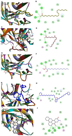 Depiction of 3D and 2D binding modes of compounds 8 (A,B), 7 (C,D), 9 (E,F), 10 (G,H), and 14 (I,J) into the active site of SARS-CoV-2 RdRp (PDB entry: 6NUR).