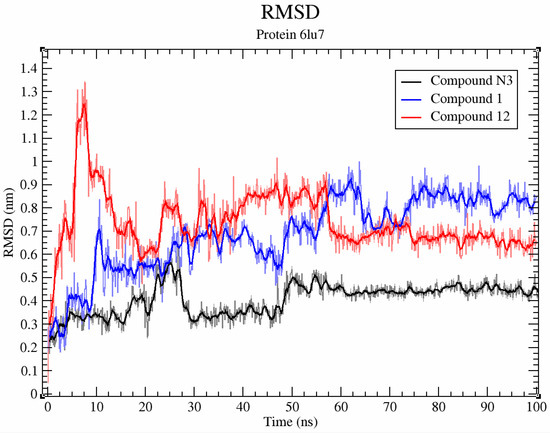 Compounds 1 and 12, as co-crystallized ligands (N3) (PDB ID 6LU7), are relatively stable (Figure 8, average RMSD < 0.2 nm), but undergo noticeable deviation during interaction with the SARS-CoV-2 3CL protease (PDB ID 6LU7).