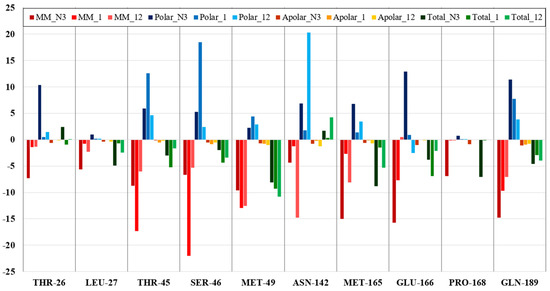 A comparison of the total contribution energies (ΔGtotal = ΔEMM + ΔGpolar + ΔGapolar) of the interacting amino acid residues of the SARS-CoV-2 3CL protease for compounds 1 and 12 is presented in Figure 9.