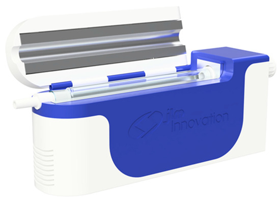 Modular breath analyzer (MBA) platform based on chemoresistive sensors for laboratory and clinical use; external view with cap opened to exchange the glass sampling tube.