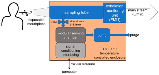 The presented novel modular breath analyzer (MBA) platform is developed for laboratory and clinical use. The internal components of the MBA platform are shown in Supplementary Materials, Figure S1, while its basic arrangement and the connection of the individual units is shown with a schematic drawing of the MBA platform in Figure 2. It contains a direct breath sampling unit and three modules able to host different types of sensors and technologies. The MBA platform contains three main units: (i) a sampling unit with an internal exhalation monitoring unit (EMU), (ii) a temperature control unit and (iii) a modular sensing chamber unit. The sampling unit is especially designed for breath analysis, based on the buffered-end-tidal (BET) sampling process [83]. Our presented system weights about 2.1 kg and has the dimensions 280 mm × 118 mm × 75 mm.