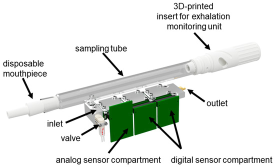 To utilize the buffered end-tidal breath sampling method, we designed a specific valve-controlled inlet for our recently published sensing chamber [80,81,82] to be able to plug the exchangeable glass sampling tube to the sensing chamber of our eNose system. The current sensing array setup consists of three compartments: one with 8 analog and two with 10 digital sensors each. The low volume of the sensing unit (less than 3 mL) ensures that the volume of the sensor chamber could be flushed several times with the BET air from the sampling tube. The sensing unit consists of a modular sensor array that contains three exchangeable sensor modules with a valve-controlled inlet connected to the sampling tube and one outlet (can be seen in Figure 3). The exchangeable modular design of the sensor unit allows the MBA to host three modules containing sensors of different types, but those three modules can also contain the same type of sensors, which is useful in the study of sensor chip variability.