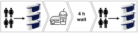A group of 15 generally healthy 17–18 year old individuals were recruited for an experimental study using three modular breath analyzer prototypes, the first breath sample was obtained following a 12 h fasting period with all three MBA devices; then the participants were given a standardized meal and invited for a follow-up (second) breath sample 4 h thereafter. The test-meal was a hamburger with 0.5 L water. To avoid potential contaminants, on the day of testing the recruited study participants did not use mouthwash, chewing gum, furthermore they did not perform excessive physical activity, did not smoke or consume alcohol for 24 h before the breath test. The same restrictions were applied to the 4-h pause between two measurements. This experimental routine was repeated three times, each measurement day was one week apart from the previous one. The general scheme of the breath sample collection (measurement day) of the pilot study can be seen in Figure 4. Signed consent was obtained from all recruited study participants. For study participants under 18 years of age the parents or legal guardians signed this consent.
