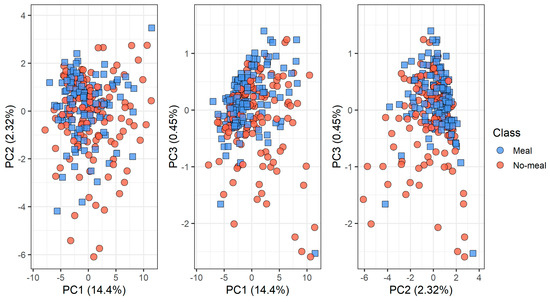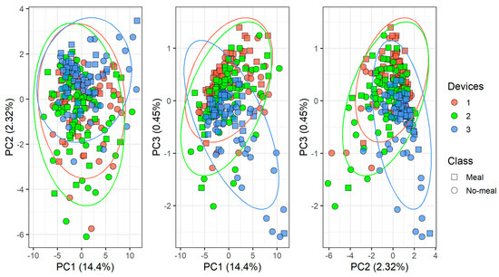 Figure 6 and Figure 7 show the PCA scores plots of the complete data set according to the devices and the meal status (classes), respectively. Measurements from the three devices depend strongly on the device, since the breath samples come from the same individuals and the sampling is made on each device one right after the other (Figure 6). On the other hand, a certain degree of overlap between the data classes meal/no-meal can be seen in Figure 7. This happens in every device, as it is shown by the sample symbols shown in Figure 6.