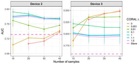 where Cm and Cs are the master’s and slave’s data covariance matrices, respectively, adapted with a small regularization parameter λ that allows it to be full rank and thus the square root to be computed. Therefore, CORAL uses two steps to align both data distributions: whitening the master data and re-coloring it with the slave covariance.