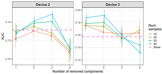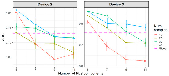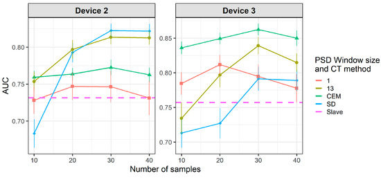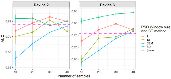 An additional reference can be considered for the CT algorithms that need known labeled transfer samples from S; the calibration extension method (CEM) which consists of the LDA classifier built with M’s training samples plus original (non-corrected by CT) S’s labeled transfer samples, this is S’s samples without CT. Then, the CT can be considered good if its AUC overcomes the CEM’s AUC. The procedure is repeated 20 times and the AUC and SE are computed.