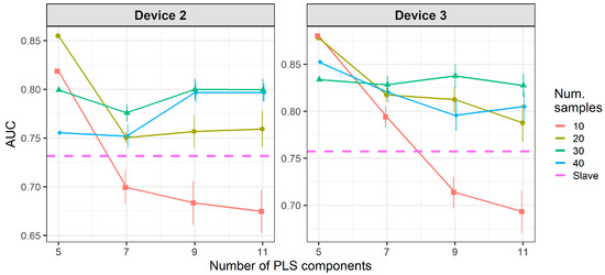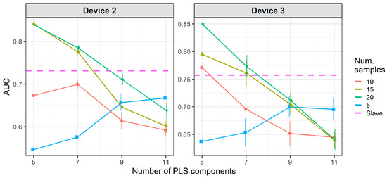 As specified above, the results of the classifier built in M and applied on each S is considered the reference for the evaluation of the CTs. The considered classifier is linear discriminant analysis (LDA) with a previous dimensionality reduction task using principal component analysis (PCA). Therefore, the number of PCA components (nPCs) for the PCA + LDA classifier is the parameter to be selected. For this, cross-validation is made on two random subsets of the M’s data: a training set containing 48 samples with equally represented classes (24 + 24), and a validation set with the remaining samples (~39). The procedure is repeated 20 times for each parameter value to obtain the optimal nPC.