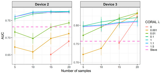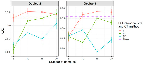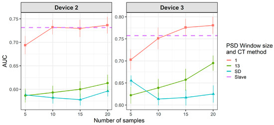 Since only two classes are involved in the classification task, the classification results are given in area under the receiver operating characteristic curve (AUC) and standard errors (SE). Results for each S device are compared before and after the application of the CT algorithms; if the results of the corrected S data (after CT) are similar to the M’s reference classification result we consider a successful CT, if the S’s result is higher than the one before the CT (threshold) we consider good CT.