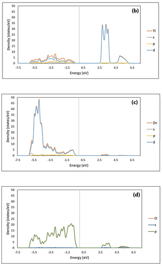 The total and partial density of states (DOS) of ZnTiO3 and TiO2 are illustrated in Figure 3 and Figure 4, respectively. Figure 3a shows that the total density of state (TDOS) of ZnTiO3 has two main zones: an upper conduction band (CB) zone from 2.5 to 6.2 eV, and a lower valence band (VB) zone, from −6.0 to −0.2 eV. The CB is dominated by the contribution of Ti, while the VB is dominated by the contribution of Zn and O. Figure 3b–d show the partial density of state (PDOS) of ZnTiO3. As can be seen in Figure 3b, the main contribution of Ti in the CB is through the 3d orbital. On the other hand, Figure 3c shows that Zn contributes mainly to the VB through the 3d orbital while O interacts with Zn in this band through the 2p orbital shown in Figure 3d.