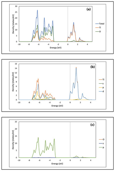 Likewise, Figure 4a shows that the total density of state (TDOS) of TiO2 has two main zones: an upper conduction band (CB) zone from −0.1 to 3.8 eV, and a lower valence band (VB) zone, from −7.6 to −2.8 eV. The CB is dominated by the contribution of Ti, while the VB is dominated by the contribution of O. Figure 4b,c show the partial density of state (PDOS) of TiO2. As can be seen in Figure 4b, the main contribution of Ti in the CB is through the 3d orbital. On the other hand, Figure 4c shows that O contributes mainly to the VB through the 2p orbital.