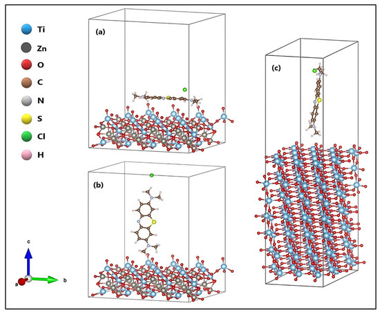 Methylene blue (MB) molecule in (a) horizontal and (b) semi-perpendicular orientation on the ZnTiO3 surface, and (c) semi-perpendicular orientation on the TiO2 surfaces.