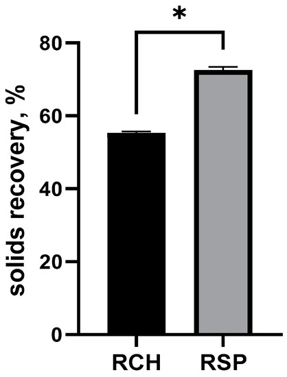 Solids recovery (%) of spray-dried algae-rosemary particles. RCH: Chlorella-rosemary particles and RSP: Spirulina-rosemary particles. Bars indicate standard deviation. Samples marked with an asterisk are significantly different: * p < 0.05.