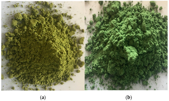 Visual aspect of spray-dried (a) Chlorella-rosemary (RCH) and (b) Spirulina-rosemary (RSP) particles.