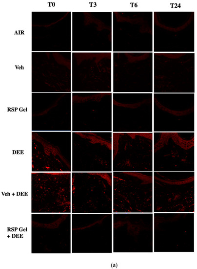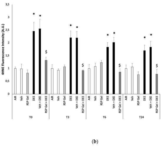 As depicted by the immunofluorescence assay in Figure 4a, DEE significantly promoted the formation of cutaneous 4HNE-PA, a well-known marker of lipid peroxidation-mediated protein damage [23]. In particular, the 4HNE-PA signal was evident in the stratum corneum and epidermis, which are the main targets of pollution-mediated damage [24]. Of note, 4HNE-PA immunofluorescent reaction was also slightly detected in the dermal layer of DEE-exposed skin (Figure 4a). Quantification of fluorescence intensity confirmed the increase of 4HNE-PA levels after DEE exposure (T0, 30′) and, although with a declining trend, remained significantly higher in pollutant-exposed tissues than in air-exposed skin for up to 24 h after DEE insult (Figure 4b). The topical pretreatment for 24 h with RSP gel significantly prevented 4HNE-PA formation in DEE-exposed skin tissues, to a similar extent for all time points tested (Figure 4b). No effect of RSP gel and vehicle (Veh) was noticed in air-exposed skin explants (Figure 4a,b).