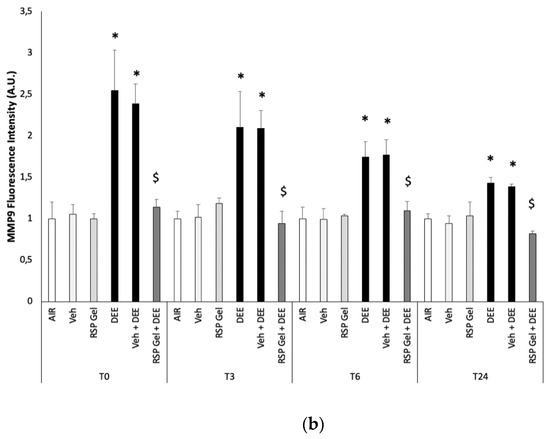 Accumulation of 4-HNE-modified proteins in the skin tissue can trigger cascades of proinflammatory signals and mediators including extracellular matrix-degrading metalloproteinases (MMPs) [25]. Therefore, we next evaluated the activation of MMP-9 by DEE exposure in the presence or not of the RSP gel. As depicted in Figure 5a, the dermal layer of DEE-exposed skin showed a higher immunoreaction for the active form of MMP-9 than that observed in skin tissues not exposed to DEE. The quantification of fluorescence signal demonstrated that the increase of MMP-9 active form was more evident 30 min after DEE exposure, and its increase was still significant at 3, 6 and 24 h (Figure 5b). As observed for 4HNE-PA, 24 h pretreatment with algae-rosemary gel was able to inhibit the increase in active MMP-9 levels in skin tissues exposed to DEE (Figure 5a,b). No effect of the vehicle (Veh) only treated tissues was noticed.
