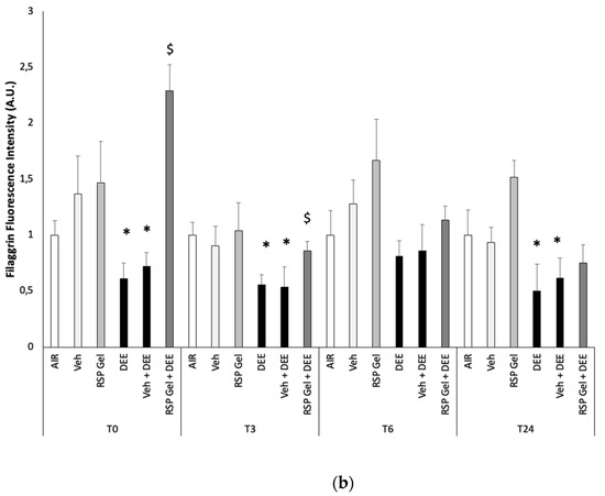 Skin exposure to pollution can also impact cutaneous barrier functions [26]. As shown in Figure 6a, DEE exposure clearly decreased the filaggrin levels (a key protein involved in maintaining the stratum corneum properties). Indeed, we observed a clear decrease in immunofluorescence staining for filaggrin in the stratum corneum of DEE-exposed skin (Figure 6a), and this was evident already 30 min after DEE exposure and persist also after 3 and 24 h post-exposure (Figure 6b). Notably, 24 h-pretreatment with RSP gel prevented the stressor-mediated decline in filaggrin levels (Figure 6a,b).