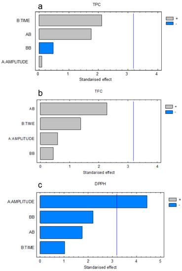 | Amplitude (%) | Time (min) | TPC (mg GAE/g *) | TFC (mg CE/g *) | AC (DPPH) (mg TE/g *) |