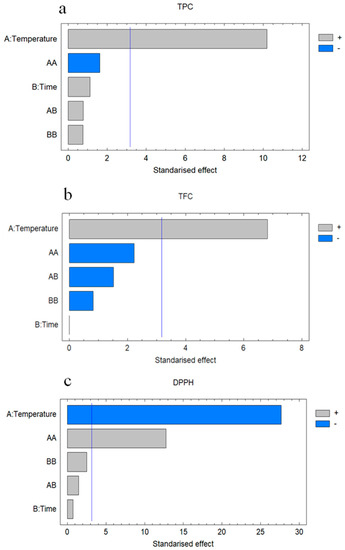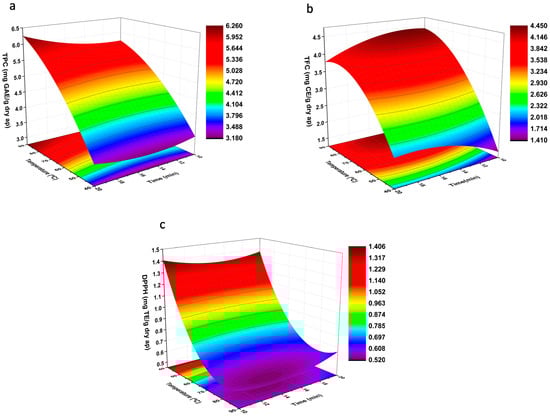 | Temperature(°C) | Time (min) | X1 | X2 | YTPC (mg GAE/g *) | YTFC (mg CE/g *) | YDPPH (mg TE/g *) | ||