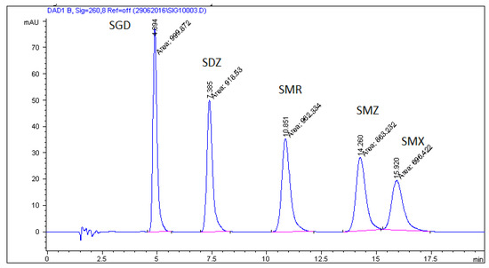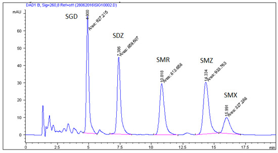 Feed sample spiked with all analyzed sulfonamides at a concentration 200 mg/kg (SGD—sulfaguanidine; SDZ—sulfadiazine; SMR—sulfamerazine; SMZ—sulfamethazine; SMX—sulfamethoxazole).