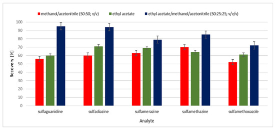 Effect of the extraction solution for recovery of the analyzed compounds (n = 3).
