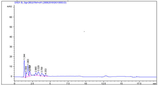 The HP 1100 Series separation modules Agilent Technologies (Santa Clara, CA, USA) was used for the analysis. The chromatographic separation was accomplished with isocratic elution on Zorbax Eclipse XDB column C18, 150 × 4.6 mm, 5 μm (Agilent Technologies, Santa Clara, CA, USA), using a MLC mobile phase consisting of 0.05 M sodium dodecyl sulphate/0.02 M phosphate buffer (pH = 3) and 6% propan-2-ol mixture prepared in one glass bottle. The flow rate was 0.6 mL/min and the column thermostat was set at 30 °C. The injection volume was 10 μL. The UV detection was monitored at 260 nm.