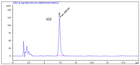 Standard stock solutions of individual sulfonamides (10 mg/mL) were prepared in methanol for sulfaguanidine, sulfamethazine, sulfamerazine, and sulfamethoxazole. A sulfadiazine (SDZ) standard was prepared by dissolving in acetonitrile. They were stored in a freezer at −20 °C and found to be stable for six months.