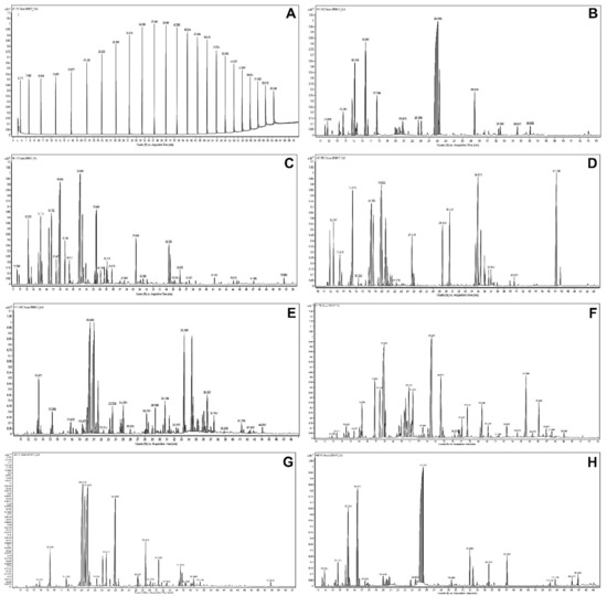 - Adams, R.P. Identification of Essential Oil Components by Gas Chromatography/Mass Spectorscopy, 4th ed.; Allured Publishing Corporation: Carol Stream, IL, USA, 2007; ISBN 978-1-932633-21-4. [Google Scholar]
